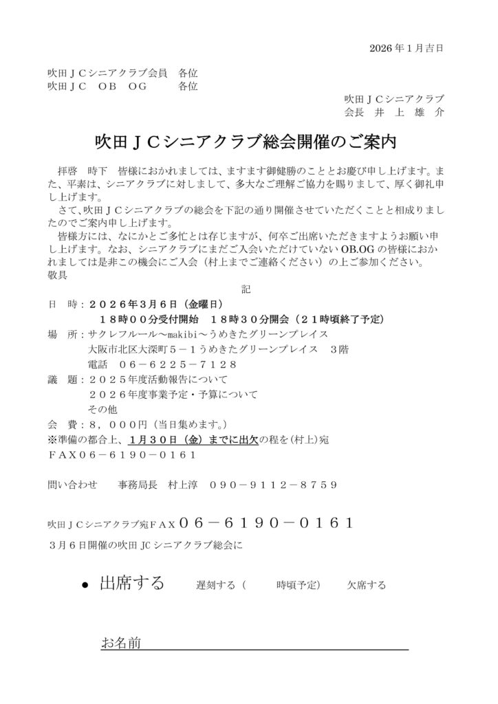 さて、吹田JCシニアクラブの総会を下記の通り開催させていただくことと相成りましたのでご案内申し上げます。